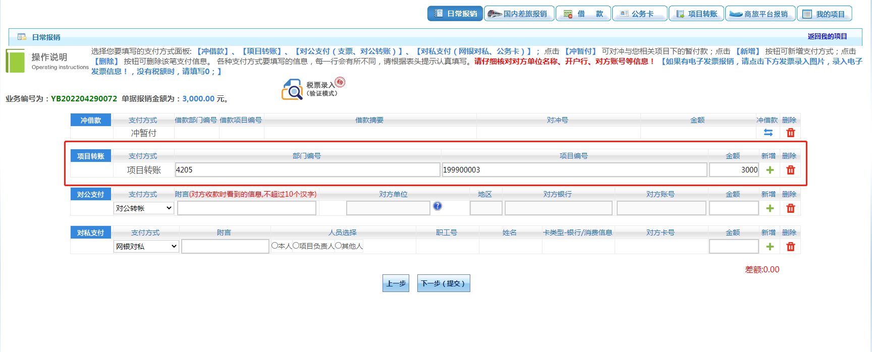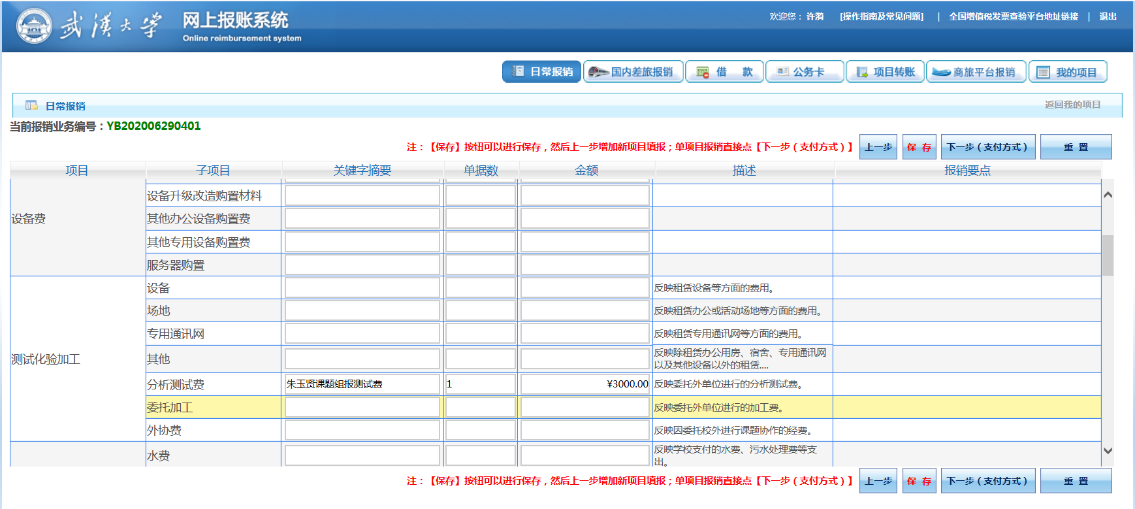 第二步:信息门户→财务综合服务平台→网上报账系统→日常报销→选择项目号等信息→项目找到测试化验加工,子项目找到分析测试费,关键字摘要填写XXX(导师姓名)课题组报测试费→项目转账(4205-199900003),填写金额并提交→打印报销单
