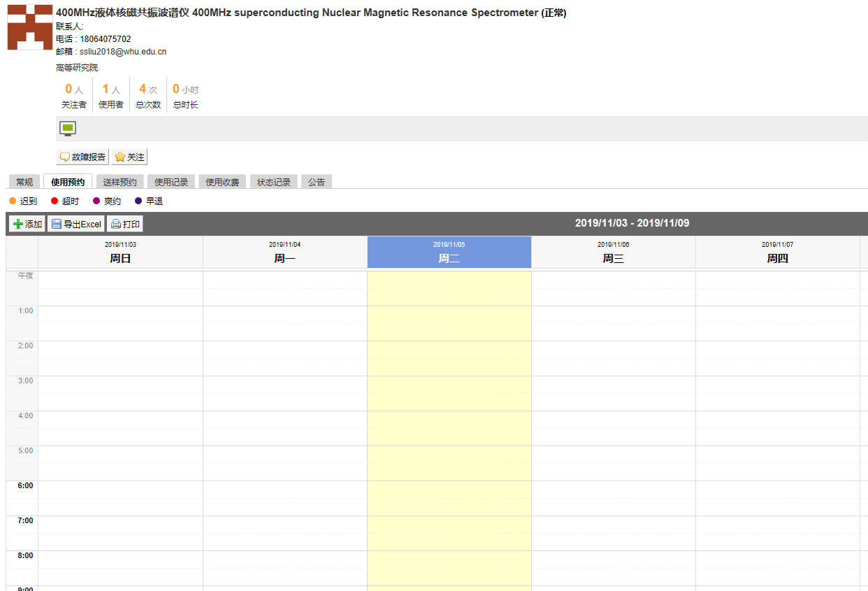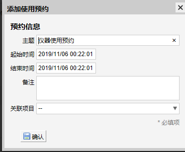 如需预约使用,请点击仪器下放的预约,进入仪器预约界面,点击空白预约时间段,弹出预约窗口(注:只有培训合格,有仪器使用资格,才能预约使用,培训后请联系管理员授予使用权限)