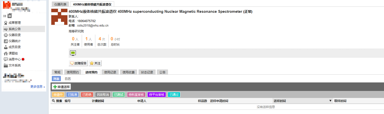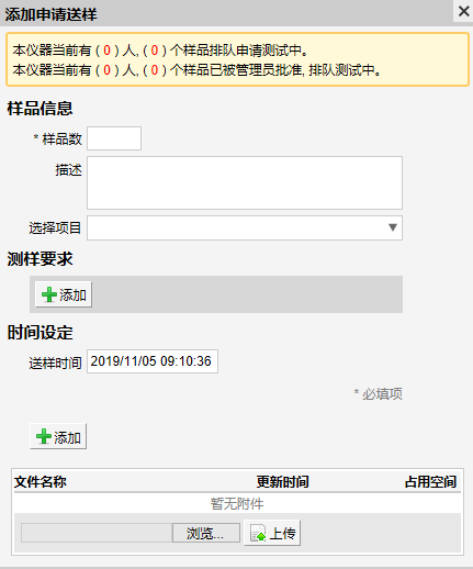 如需送样,请点击仪器下放的送样按钮(送样前请仔细阅读公告)