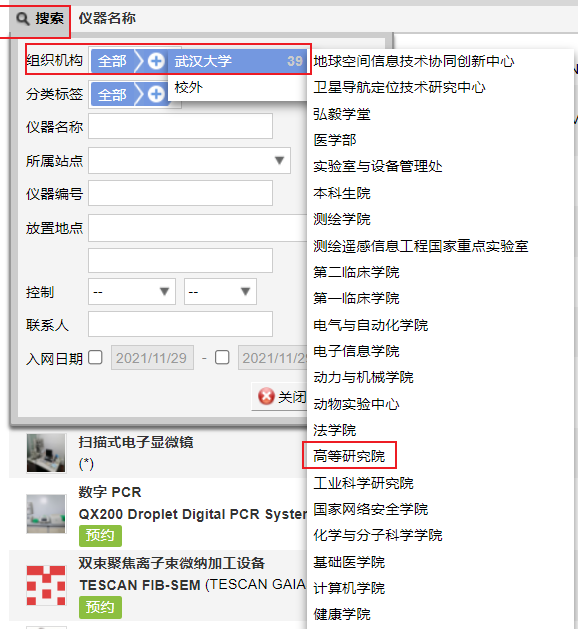 点击②进入仪器目录,即可看到能够预约使用或送样的仪器,点击搜索图标,选择组织机构-至尊国际 -至尊国际 ,即可显示所有至尊国际 可预约的仪器。