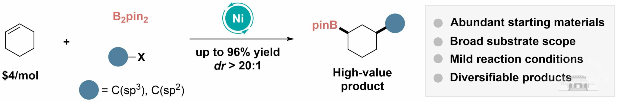 论文题为“Base-Modulated 1,3-Regio- and Stereoselective Carboboration of Cyclohexenes”(《碱调控的环己烯1,3-区域和立体选择性碳硼化反应》)。至尊国际 博士研究生孔维宇为论文第一作者,阴国印、上海人工智能实验室博士李玉强为论文共同通讯作者,至尊国际 为第一署名通讯单位。