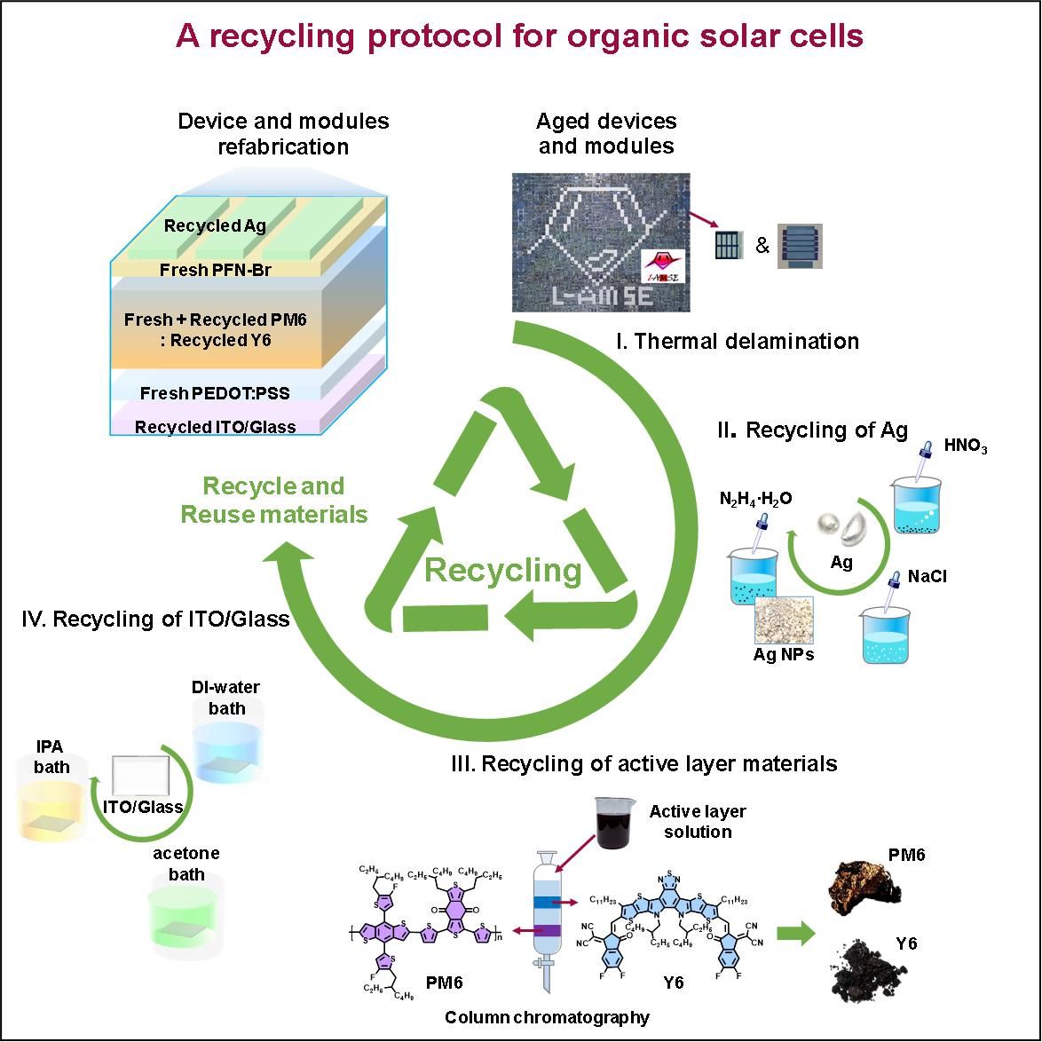 溶液加工有机光伏(OPVs)因其轻质、半透明、多彩和可柔性制备等优势,具有广泛的应用前景,如可穿戴电子产品、自供电设备和光伏建筑一体化。与其他光伏技术相比,OPVs的潜在竞争力在于其功能层均可通过溶液加工,从而实现极低的加工成本。然而,构成OPV器件的主要部件材料(包括活性层材料、界面层材料、金属电极材料以及透明导电玻璃基板材料)成本极高,使得现阶段实现OPV应用变得困难。因此,除了设计高性能、低成本的功能层材料以外,迫切需要开发一种通用的废弃OPV器件回收协议,实现主要部件材料的快速分离、回收和再利用,可有效节省原材料、能源和生产时间,对推动OPVs应用意义重大。