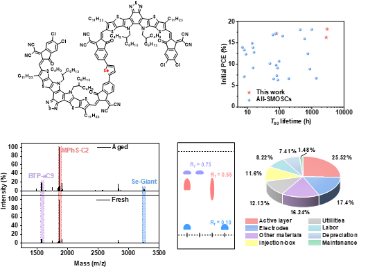 有机太阳能电池(OSCs)因其独特的优势在新能源领域受到了越来越多的关注。其轻量化和柔性设计使其成为便携式设备、可穿戴技术和建筑一体化应用的理想选择。此外,有机光伏材料的环境友好性和可降解性进一步推动了绿色能源的普及。随着材料设计策略与器件优化工艺的不断发展,OSCs的光电转化效率不断提升,已在实验室条件下突破20%,展现出巨大的市场潜力和广泛的应用前景。但是相应光伏材料体系的可加工性能(例如:材料批次重复性,活性层膜厚耐受性,尺寸滞后效应等),制备成本以及器件运行稳定性仍然限制着有机太阳能电池的商业化进程。因此,协同优化OSCs的效率,稳定性,成本,以及可加工性能对于助力有机太阳能电池的商业化发展具有重要意义。全小分子有机太阳能电池(all-SMOSCs)因其活性层材料分子结构明确,被视为解决OSCs领域材料批次重现性问题的重要手段。然而,由于材料分子尺寸较小,相转变温度(Tg)较低,该类体系的稳定性远落后于基于聚合物的太阳能电池。