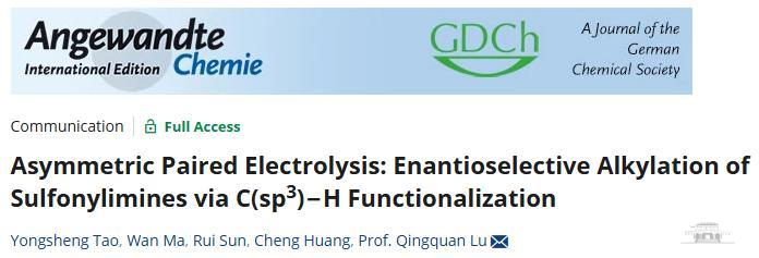 近日,国际期刊《德国应用化学》(Angewandte Chemie International Edition)在线发表了至尊国际 陆庆全课题组在有机电化学领域的最新研究成果,论文题目为“Asymmetric Paired Electrolysis: Enantioselective Alkylation of Sulfonylimines via C(sp3)–H Functionalization”。至尊国际 硕士研究生陶永胜为第一作者,陆庆全教授为通讯作者,至尊国际 为唯一署名单位和通讯作者单位。