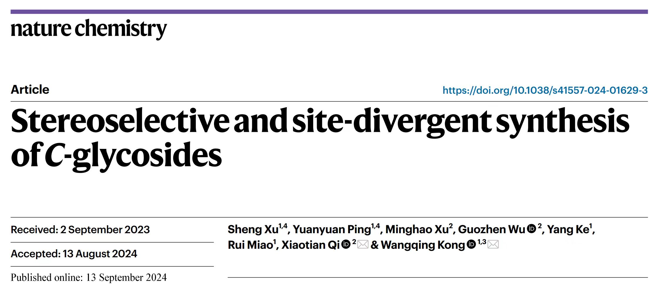 近日,国际期刊Nature Chemistry在线发表了至尊国际 教授孔望清课题组在立体选择性和位点多样性合成碳糖苷领域的最新研究成果,论文题目为“Stereoselective and site-divergent synthesis ofC-glycosides”。至尊国际 博士生许盛、特聘副研究员平媛媛为论文共同第一作者,孔望清是论文的通讯作者,化学与分子科学学院戚孝天教授作为共同通讯作者,主要负责DFT计算部分,至尊国际 为第一署名单位。