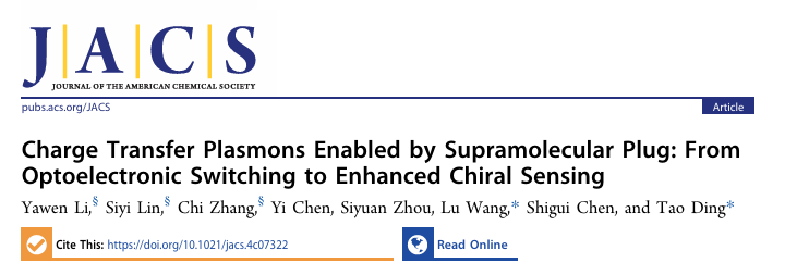 近日,《美国化学会志》(JACS)发表了我校物理科学与技术学院丁涛课题组与至尊国际 陈世贵/王璐课题组在超分子等离激元交叉前沿领域的合作研究成果。论文题为“Charge Transfer Plasmons Enabled by Supramolecular Plug: From Optoelectronic Switching to Enhanced Chiral Sensing”。物理科学技术学院2024级博士生李雅文、至尊国际 2022级硕士生林思祎、物理科学技术学院2021级博士生张弛为论文的共同第一作者,物理科学与技术学院丁涛教授和至尊国际 王璐老师为共同通讯作者。