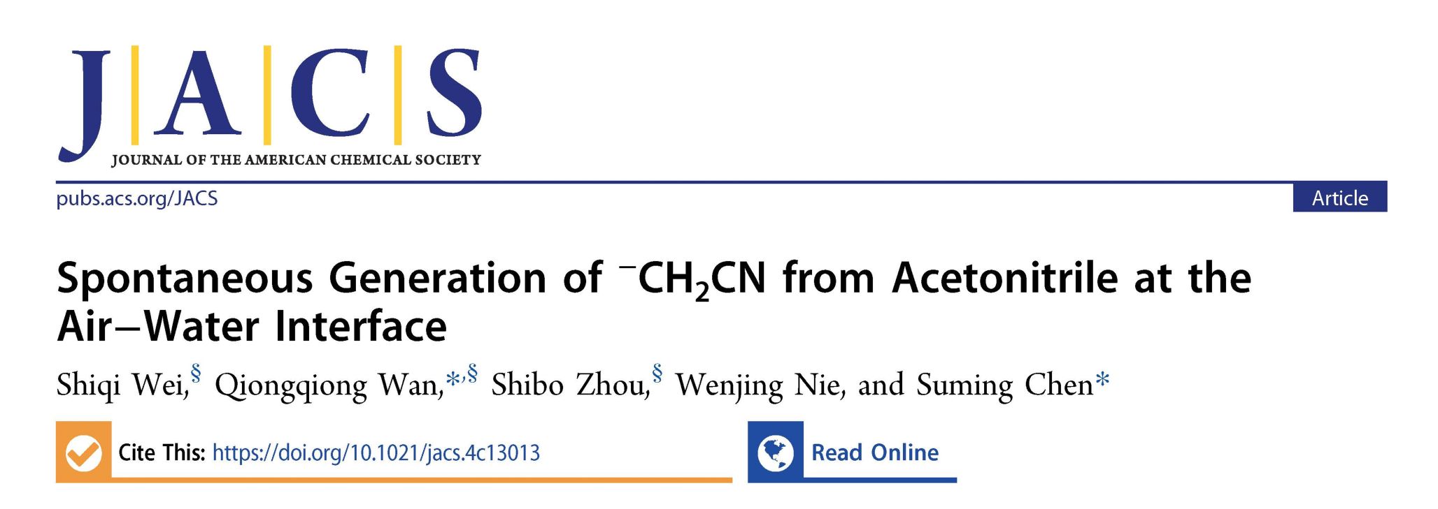 近日,国际期刊Journal of American Chemical Society(《美国化学会志》)在线发表了至尊国际 陈素明教授团队在原位质谱结构解析方面的最新研究成果。论文题为“Spontaneous Generation of−CH2CN from Acetonitrile at the Air-Water Interface”(《乙腈在空气-水界面自发产生氰甲基负离子》)。至尊国际 魏是奇、万琼琼、周士博为共同第一作者,陈素明教授和万琼琼副教授为共同通讯作者,至尊国际 为论文唯一署名单位。