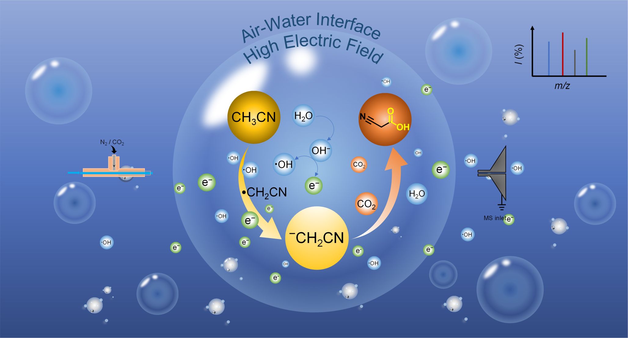 为了探究CH3CN在空气-水界面的化学转化过程,他们建立了研究气液界面反应的原位质谱分析装置,发现并验证了在空气-水界面上,CH3CN在水溶液中会前所未有地自发去质子化生成−CH2CN,并通过捕获关键中间产物和计算化学,揭示了•OH和电子在气液界面协同氧化-还原CH3CN的间接去质子化机制。•OH会进攻CH3CN经过过渡态[HO···CH3CN]‡生成•CH2CN,•CH2CN再从气-液界面得到一个电子生成−CH2CN。此外,还观察到多重的间接去质子化-质子化的动态过程。为了对−CH2CN进行精准结构鉴定和反应性研究,实验在线解析了其与丙酮、苯甲醛和母体CH3CN分子的亲核加成反应,确证了−CH2CN的结构与高反应活性。此外,原位质谱分析还证明,气-液界面上生成的−CH2CN能与CO2发生无能垒亲核加成反应生成2-氰基乙酸,用于CO2的固定。本研究揭示的协同氧化还原反应过程为气-液界面化学转化提供了新的思路,所发现的独特的CH3CN反应可能为解开大气环境中CH3CN转化之谜提供新的线索。