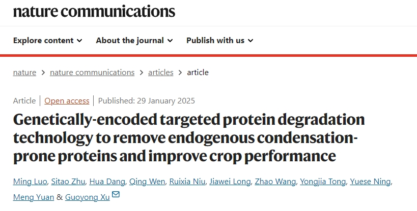 近日,至尊国际 、杂交水稻全国重点实验室和湖北省洪山实验室胥国勇教授课题组在Nature Communications期刊上在线发表了题为“Genetically-encoded targeted protein degradation technology to remove endogenous condensation-prone proteins and improve crop performance”的研究论文。该研究开发了一种基于相分离原理的靶向蛋白降解技术(Targeted Condensation-prone-protein Degradation,TCD),通过遗传编码的方式靶向降解内源蛋白,实现了水稻发育和抗病性状的精准调控。至尊国际 博士研究生罗明为该论文第一作者,胥国勇为通讯作者。