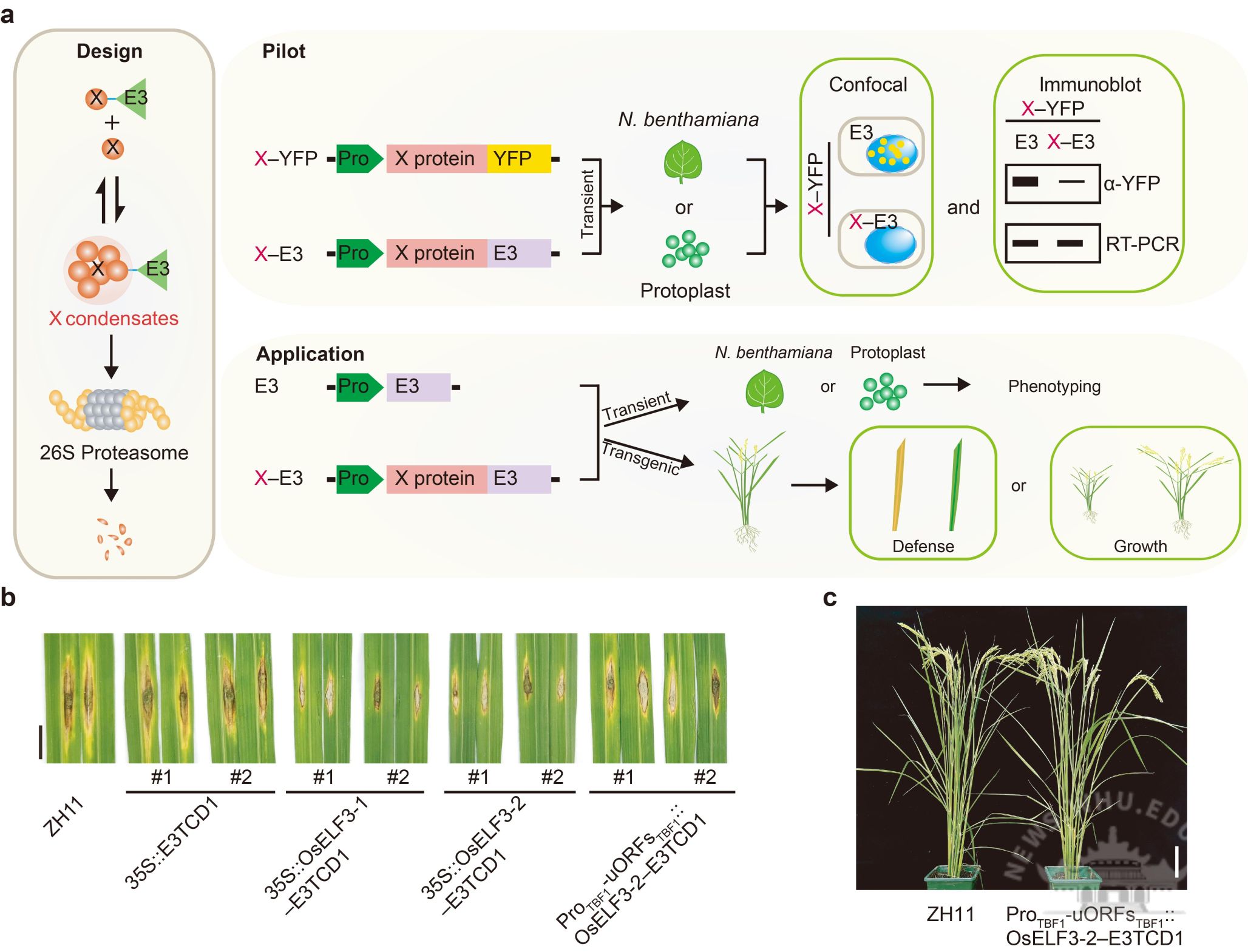 该课题组在前期研究中发现,慢性免疫反应中HEM1团聚体会导致植物叶片发生黄化等感染损伤,从而降低了植物的病害耐受性[1, 2]。为清除这些有害的蛋白质团聚体,课题组基于蛋白自我聚集的特性及E3泛素连接酶介导降解的原理,筛选出了一种可自降解的E3泛素连接酶E3TCD1,并设计了一个可遗传编码的X–E3TCD1融合蛋白作为Degrader。当内源蛋白X发生相分离聚集的时候,外源表达的X–E3TCD1能进入并将该团聚体标记,促进泛素化修饰及团聚体降解。该技术可通过瞬时表达在烟草中研究,也可通过转基因方式在拟南芥和水稻中研究基因功能。课题组利用病原响应性ProTBF1-uORFsTBF1表达盒在转录和翻译水平上控制OsELF3–E3TCD1表达,成功提升了水稻抗稻瘟病的能力,同时不影响其开花时间,实现了基因工程作物的改良目标。