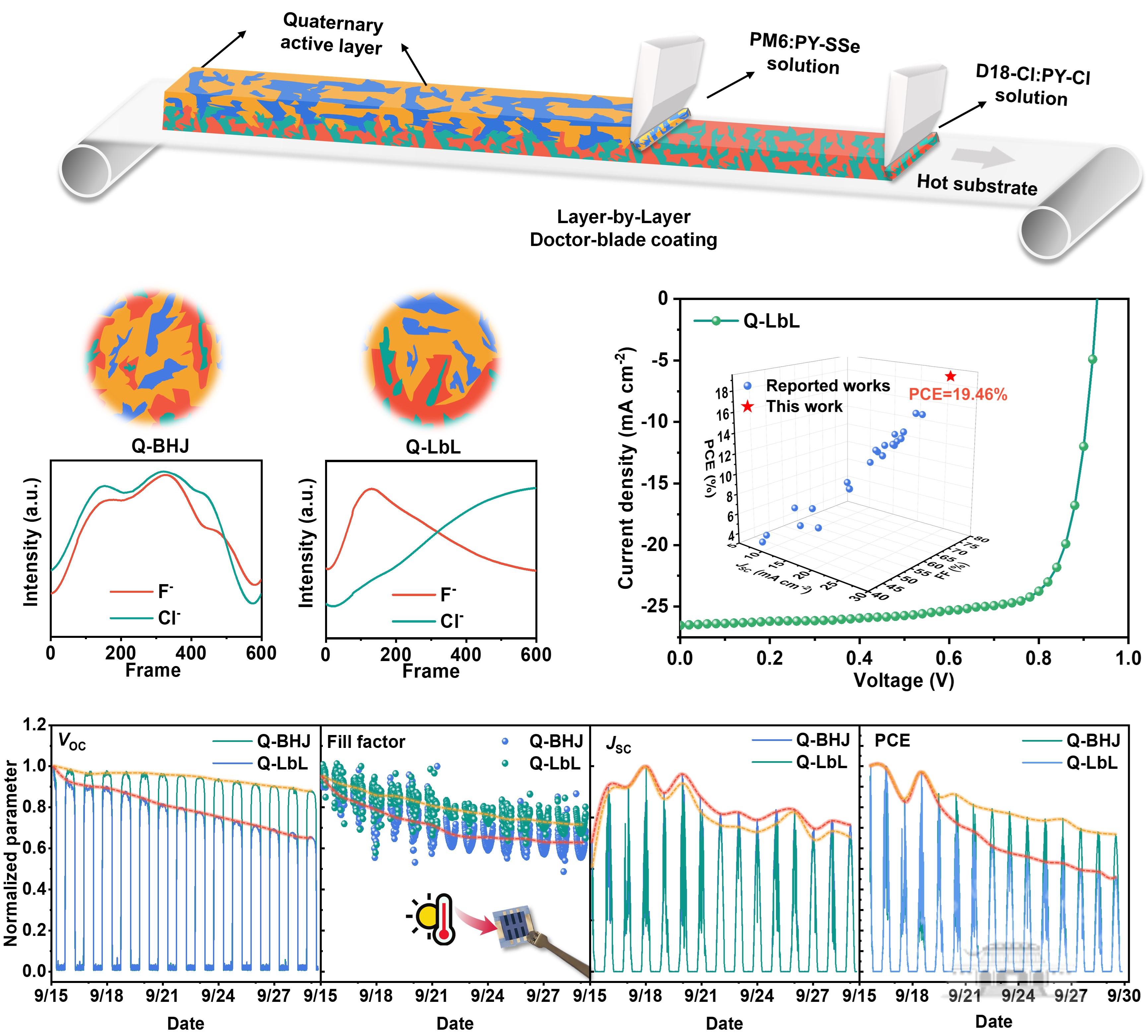 有机光伏(OPV)作为一种高效清洁能源器件,具有成本低、重量轻、溶液可加工性、半透明等独特优势,在建筑集成光伏和柔性可穿戴器件等领域具有巨大应用潜力。多组分策略是有机太阳能电池常用的实现高性能的策略之一,通过不同材料之间互补吸收和形貌改善,通常可以达到更优异的器件性能。但多组分系统的相分布和相分离尺寸需要得到有效的调控和优化,以实现更有利的载流子动力学行为和薄膜形貌稳定性。闵杰课题组率先发展了一种逐层涂覆(Layer-by-Layer,LbL)工艺以实现良好的准平面结构的活性层,并首次将其与刮涂工艺相结合,证明了LbL工艺作为一种通用的有机光伏活性层制备工艺,不仅可以实现小面积多组分器件的效率-稳定性协同优化(Joule, 2021, 5, 1548-1565;Adv Mater, 2022, 35, 2209350;Joule, 2023, 7, 221-237;),还可以克服大面积模组的“尺度滞后”效应(Joule, 2020, 4, 407-419),并且可以实现活性层的高速、可扩展、低成本印刷(Nature Energy, 2022, 7, 1087-1099),这些研究凸显了LbL刮涂工艺在调控活性层组分分布和对接工业化生产场景方面的巨大优势。