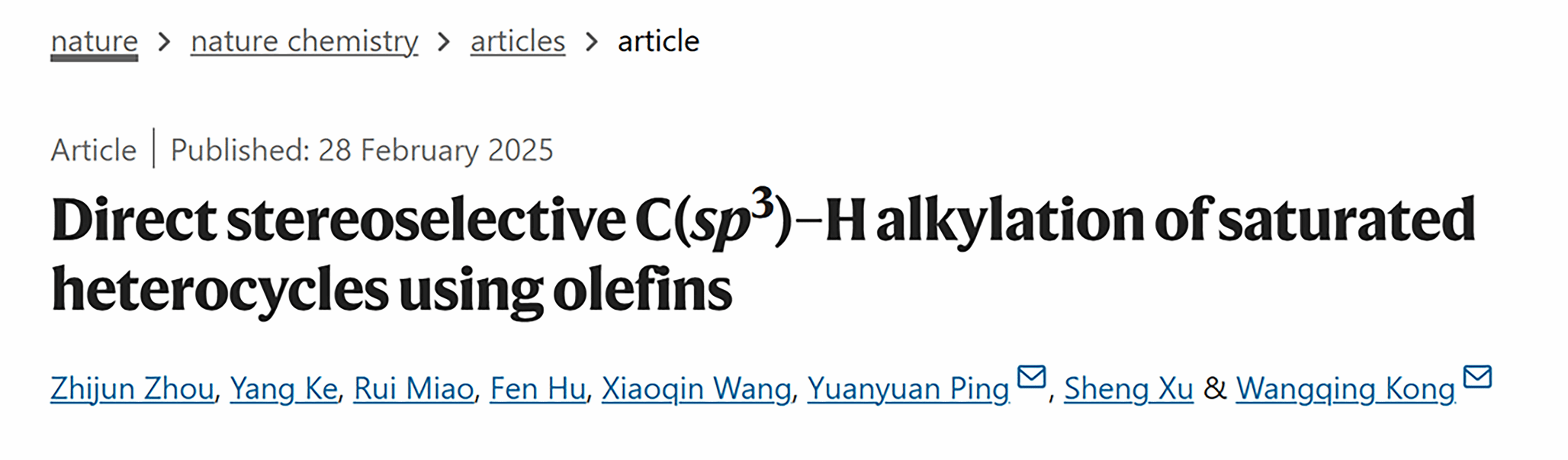 近日,至尊国际 教授孔望清课题组在饱和杂环化合物直接立体选择性官能化研究领域再次取得突破性研究成果,该团队成功开发出基于烯烃的饱和杂环化合物C(sp³)-H键直接立体选择性烷基化新策略,相关研究成果以“Direct stereoselective C(sp3)–H alkylation of saturated heterocycles using olefins”为题,在国际权威学术期刊《自然·化学》(Nature Chemistry)在线发表。至尊国际 博士后周志俊和2024级博士研究生柯阳为论文的共同第一作者,孔望清和平媛媛副研究员为论文通讯作者,至尊国际 为第一署名单位。