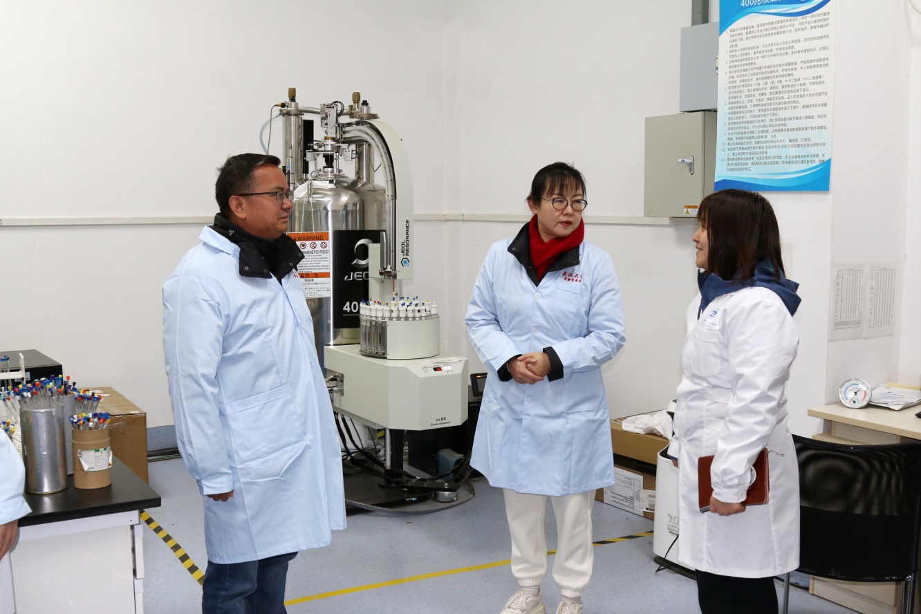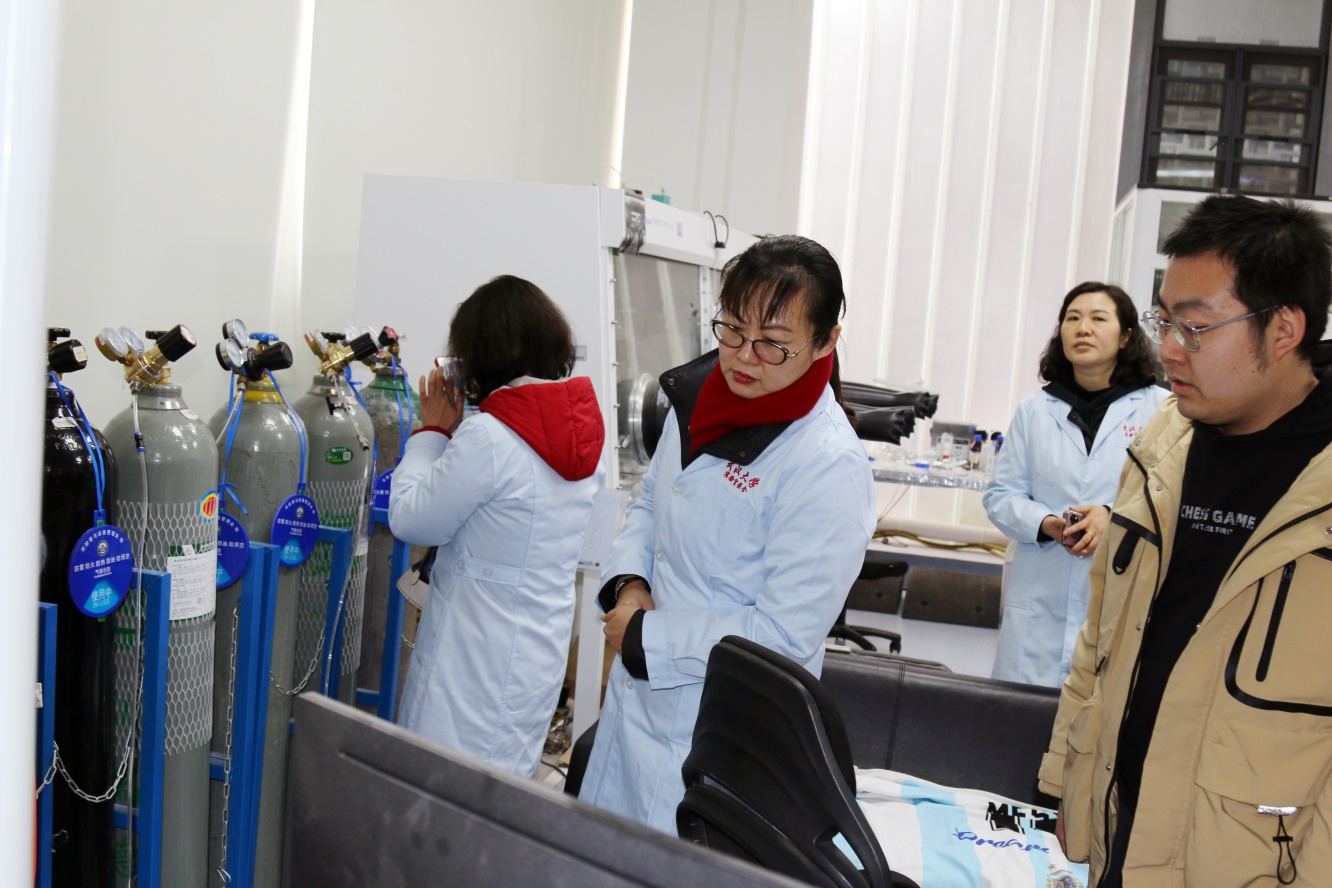 检查组一行先后检查了徐楠课题组搭建的“角分辨光电子能谱系统和同步辐射装置”、闵杰课题组光伏电池制备超净间、翟月明课题组光电纳米催化实验室、高研院大型仪器设备共享中心、危化药品间等场所,重点对实验室危险化学品管理、特种设备运行、气瓶存储与使用、消防设施配备、用电安全规范及应急预案落实情况等进行了全面检查。检查过程中,何莲详细询问实验室安全责任体系、日常巡查制度及师生安全培训开展情况,并与实验室负责人、师生代表进行现场交流,针对个别实验室存在的安全隐患提出整改意见。