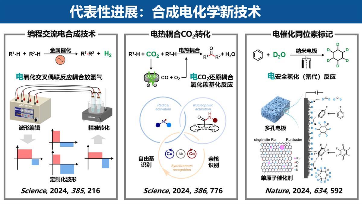 雷爱文团队在合成电化学领域接连获得重要突破,7月在《科学》上首次报道可编程波形交流电合成技术,成功发现了两类阳极氧化耦合阴极放氢气反应。通过编辑交流电的频率、电流和占空比等参数生成定制化的波形,实现对过渡金属催化物种的精准控制,突破了直流电催化对隔膜电解池的依赖。该研究为电子精准控制技术转嫁到电合成上创造了机会和条件;8月在《自然》发表纳米金属阴极催化还原氘代反应,通过电催化阴极还原策略,以廉价易得的氘水为氘源,高效构建传统方法难以合成的高价值氘代药物。该研究充分展示了合成电化学在药物开发和实际应用中的巨大潜力与广阔前景;11月在《科学》报道了电还原二氧化碳耦合氧化羰基化反应模式,将工业上最常用但有毒有害的一氧化碳升级替换成惰性无毒的二氧化碳,高效合成了医药和农药领域有重要应用的非对称脲。电热耦合模式推广到化工生产中将有望消纳二氧化碳,在物质转化层面助力国家碳达峰碳中和的发展战略。合成电化学新技术不仅在绿色物质制造等领域的广泛应用提供了新路径,还为化学化工的智能化和高端化发展注入了全新动能。这一系列成果标志着合成电化学技术迈向了精准化与多样化的台阶。