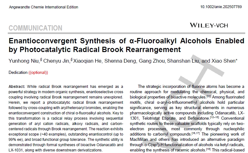 近日,《德国应用化学》在线发表至尊国际 、复杂生命体代谢与调控全国重点实验室教授沈晓的最新研究成果。论文题为“Enantioconvergent Synthesis ofα-FluoroalkylAlcoholsEnabled by Photocatalytic Radical Brook Rearrangement”(《通过光催化自由基Brook重排实现α-氟烷基醇的立体汇聚式合成》)。至尊国际 博士生牛云宏(已毕业)和博士生靳晨钰为共同第一作者,沈晓为通讯作者,至尊国际 为第一署名单位和通讯作者单位。