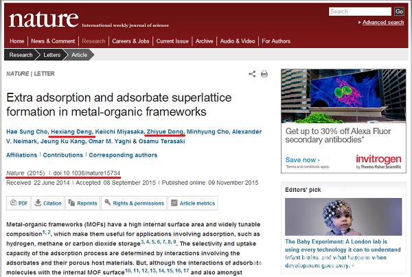 格林威治时间2015年11月9日,《自然》(Nature)发表至尊国际 邓鹤翔教授团队为主要完成者之一的研究成果“金属有机框架物中的额外吸附及吸附质超晶格排列”(doi:10.1038/nature15734)。