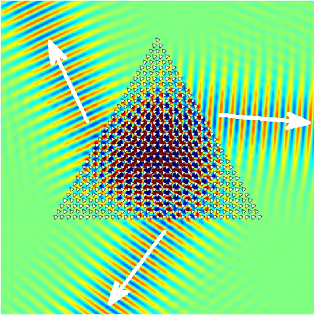 考虑水基体中六角排列的正三角形钢柱,陆等人预测了声学谷态具有涡旋状的声场分布,同时还具有手性和轨道角动量。这些声学谷态在遵守特定选择定则的情况下可由外来声场激发,这种激发方式提供了一种选择性地产生手性可控声涡旋的方法。这样的体系甚至可以展现出对于霍尔效应的声学类比。因此,尽管标量声波缺乏与电子自旋的对应量,但谷电子学的基本原理却提供了另外一种操控声波的方式。