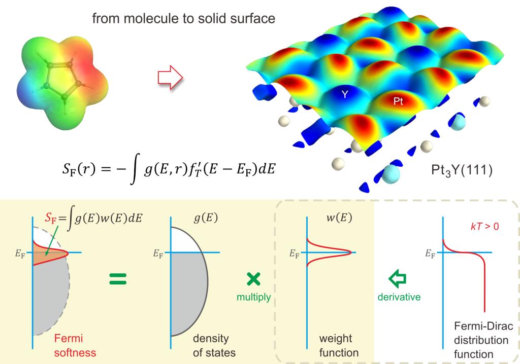 固体表面总的反应性原则上由能态密度g(E)和各能级的反应性权重w(E)两个因素共同决定。庄林等发现,虽然价电子能带中的每个能级都具有反应性,但它们对表面成键的贡献并不相等,越靠近费米能级贡献越大。基于这个事实,他们提出采用有限温度下的费米-狄拉克分布函数的导函数−fT'(E−EF)作为反应性权重函数,其最大值出现在费米能级并随能量变化逐渐衰减为零。由于对g(E)进行加权求和后所得到的物理量刚好类似于密度泛函理论(DFT)对化学软度的定义,他们将这个新的描述符命名为费米软度(Fermi softness,SF):