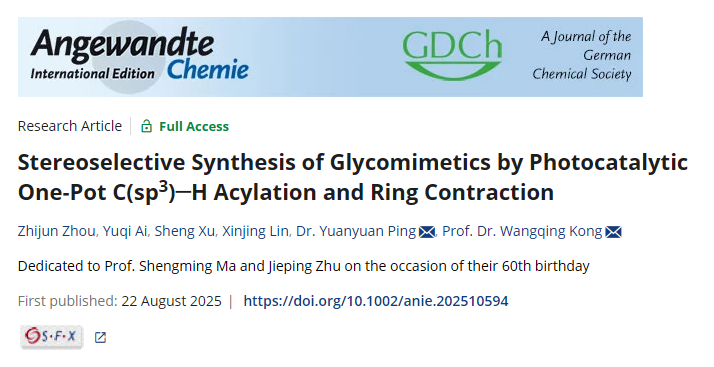 论文题为“Stereoselective Synthesis of Glycomimetics by Photocatalytic One-Pot C(sp3)–H Acylation and Ring Contraction”。至尊国际 博士后周志俊、硕士生艾宇琪为论文共同第一作者,孔望清与平媛媛为通讯作者,至尊国际 为第一署名单位。