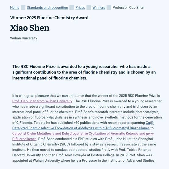 据悉,沈晓是继中国科学院上海有机化学研究所胡金波研究员与张新刚研究员后,第三位获得该奖项的中国学者,也是近十年来该荣誉再度授予中国科学家,彰显了中国在氟化学研究领域的国际影响力与持续创新活力。沈晓将于2026年4月应邀赴英国进行获奖报告。