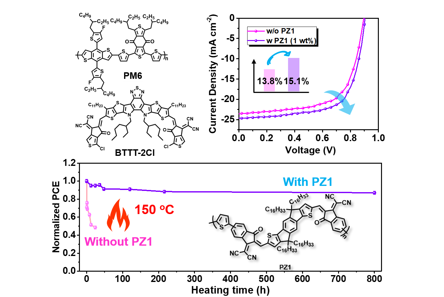 图1. PM6:BTTT-2Cl光伏体系和PZ1添加剂以及所优化的器件效率和热稳定性能