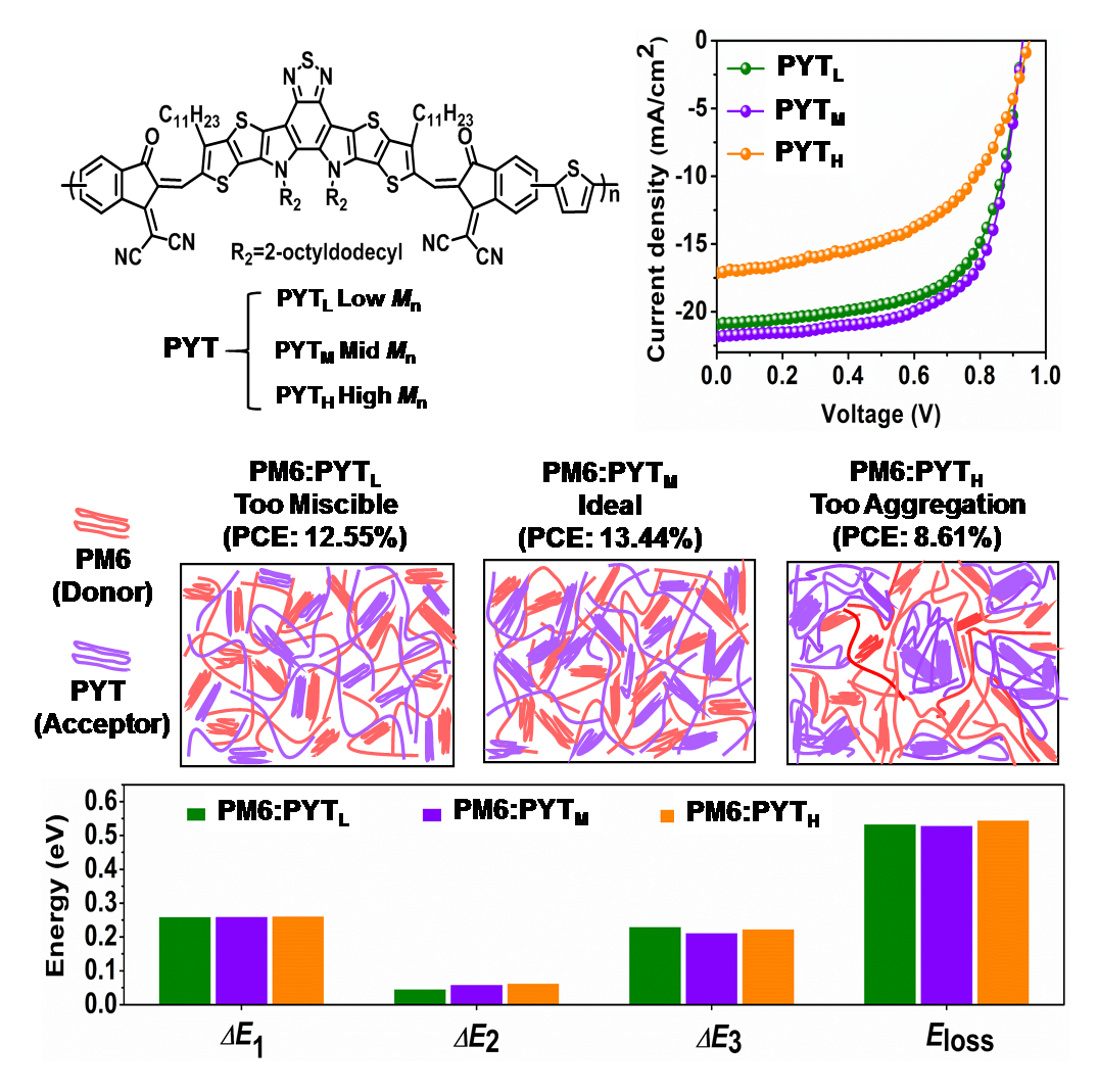 最近至尊国际 闵杰课题组的科研人员为了提高聚合物受体材料的光吸收性能,合成了一种新的聚合物受体PYT。该聚合物受体不仅具有高吸光系数1.0×105cm-1,而且其光学带隙仅为1.40 eV(吸收边为880 nm)。进一步,引入聚合物PM6作为给体材料,并通过调控PYT的分子量(低分子量PYTL,中分子量PYTM,高分子量PYTH,如图1所示)来精细优化活性层形貌。在PM6:PYT共混膜中,Flory-Huggins常数χ随着PYT分子量的增加而急剧增大,表明PM6与PYT分子间的相溶性减少,给受体聚合物趋向于自聚。通过二维掠入射X射线衍射(2D-GIWAXS)表征可知,一方面,与PM6:PYTH相比,PYTL和PYTM表现出更强的(010)“face-on”堆积和(100)层堆积,表明PYTL和PYTM的分子堆积更为有序;另一方面,相比于PM6:PYTL,PM6:PYTM展现出更小的(100)面层堆积距离和(010)面“π-π”堆积距离,表明PM6:PYTM共混膜中分子间堆积更紧密有序,更有利于电荷的传输。结果是基于PM6:PYTM活性层的器件获得了最高的电流密度(21.78 mA/cm2)和光电转换效率(13.44%)。需要进一步说明的是相比于基于PYTL和PYTH的器件,PM6:PYTM器件展示出更小的能量损失,仅为0.528 eV,这也是其能够获得高效率的重要原因之一。