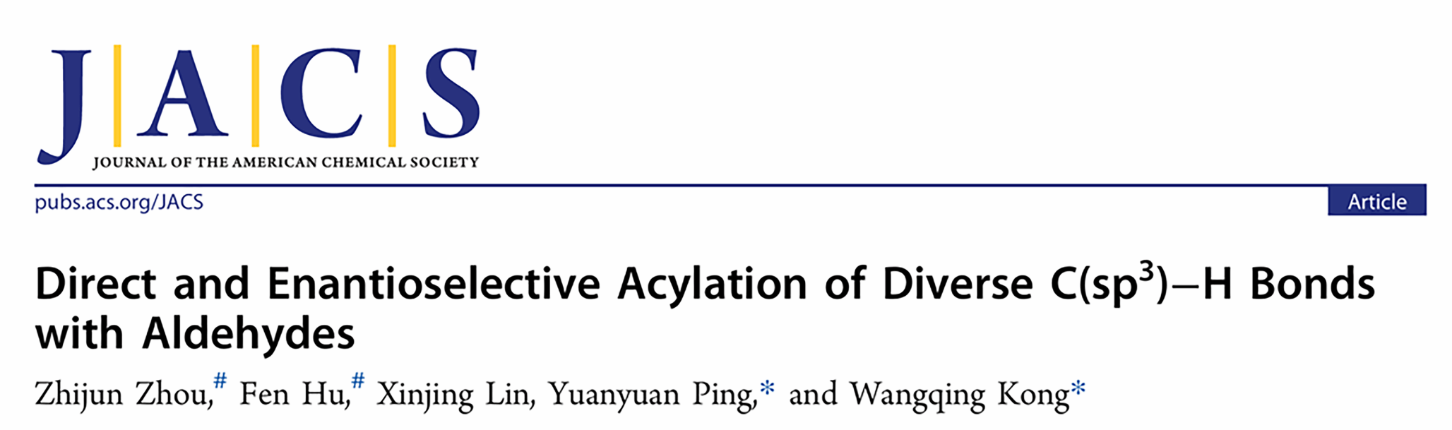 近日,至尊国际 教授孔望清、特聘副研究员平媛媛团队在Journal of the American Chemical Society(《美国化学会志》)发表了题为“Direct and Enantioselective Acylation of Diverse C(sp3)–H Bonds with Aldehydes ”的研究成果。该工作报道了一种光促氢原子转移(HAT)与镍催化协同策略,在温和条件下实现了手性α-取代酮化合物的高效合成。至尊国际 博士后周志俊、硕士生胡芬为论文共同第一作者,孔望清与平媛媛为论文通讯作者,至尊国际 为第一署名单位。