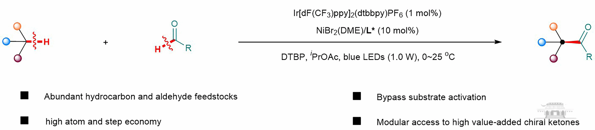 具有α-芳基、α-氨基或α-氧代叔碳立体中心的手性酮,是多种重要天然产物和药物中的独特结构单元。同时,该类化合物也是合成二醇、氨基醇等重要手性中间体的通用前体,尤其适用于构建含连续手性中心的手性结构。尽管手性α‑取代酮在药物化学领域具有重要价值,但其高效、高对映选择性的合成方法仍面临诸多挑战。孔望清研究团队系统性开展了氢原子转移(HAT)与金属协同催化实现C(sp3)–H键立体选择性官能化的相关研究,并取得系列重要突破。在2023年通过光促HAT/镍协同催化的策略,该团队成功实现了氧杂环C(sp3)–H键对映选择性芳基化和烯基化反应(J. Am. Chem. Soc.2023,145, 5231–5241.)。随后,该团队创新性地开发了氧化氢原子转移与还原偶联协同催化体系,率先实现了饱和杂环化合物的不对称C(sp3)−H烷基化反应(Nat. Chem.2025,17, 344–355.),该反应避免贵金属的使用,还解决了缺乏导向基团的饱和烃对映选择性构建C(sp3)–C(sp3)键的困难。在先前工作研究基础之上(Acc. Chem. Res.2025,58, 2477–2495.),该团队从稳定易得的醛类底物出发,利用光能量转移活化过氧化物,实现两类不同碳氢键的不对称交叉脱氢偶联(CDC),高效完成α-取代酮的对映选择性合成。值得提出的是:经典CDC反应中,过氧化物的使用通常需要加热(90 ℃)以促进其均裂产生烷氧基自由基;而光能量转移可在较低温度(0–25 ℃)下实现过氧化物的均裂,这可能是能够实现立体选择性控制的关键。