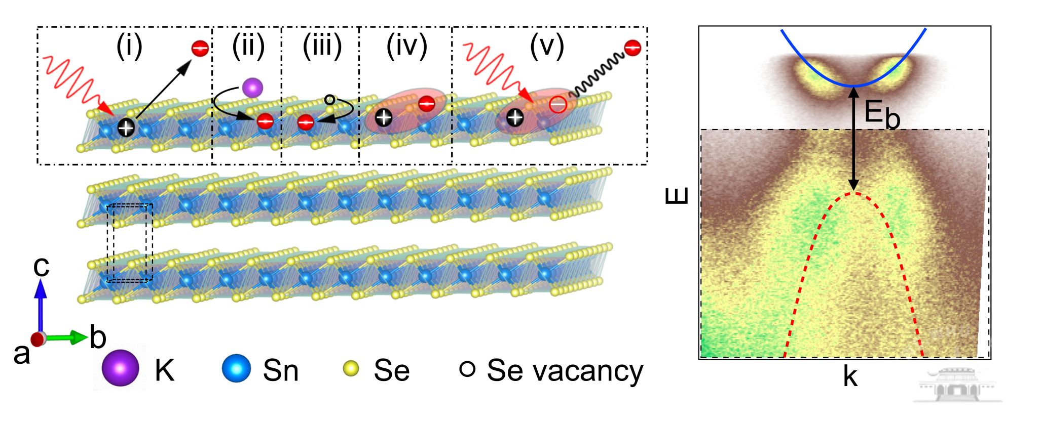 针对这一研究瓶颈,研究团队创新研究思路,依托常规角分辨光电子能谱技术(Angle-Resolved Photoemission Spectroscopy, ARPES),在电子掺杂半导体SnSe₂体系中,成功实现了准稳态暗激子的产生、表征与电子结构调控。实验结果表明,在准平衡态条件下,光生空穴与掺杂电子可结合形成长寿命暗激子,其结合能约为0.5电子伏特(eV),且在能隙区域诱发价带复制的特征谱重,为暗激子的存在提供了直接实验依据。