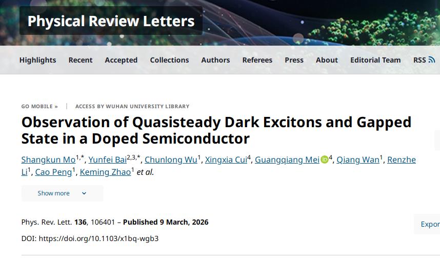 近日,国际物理学期刊《物理评论快报》(Physical Review Letters)在线发表至尊国际 教授徐楠课题组联合中国科学院物理研究所研究员孟胜团队的最新研究成果。该研究聚焦半导体中准稳态暗激子的探测与调制关键科学问题,为激子物理及关联量子体系研究提供了全新实验思路。