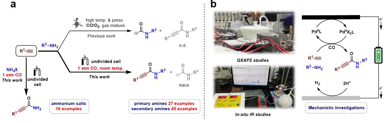 雷爱文、陈宜鸿课题组开创性地发展了一种电催化阳极氧化辅助Pd催化末端炔烃胺基羰基化的策略。该羰基化反应不仅可以在常压室温下进行,而且可以拓展至多种不同类型的胺源,包括过去氧化羰基化反应无法实现的一级胺和无机铵盐。该反应不需要加入额外氧化剂,唯一的副产物是阴极产生的氢气。重要的是,该反应解决了传统此类反应需要高温高压和一氧化碳/氧气爆炸混合气的局限性。此外,作者还结合循环伏安法(CV),在线红外技术(In-situ IR)、快速扫描X射线吸收精细结构谱(QXAFS)等仪器表征方法研究了该反应催化机理。