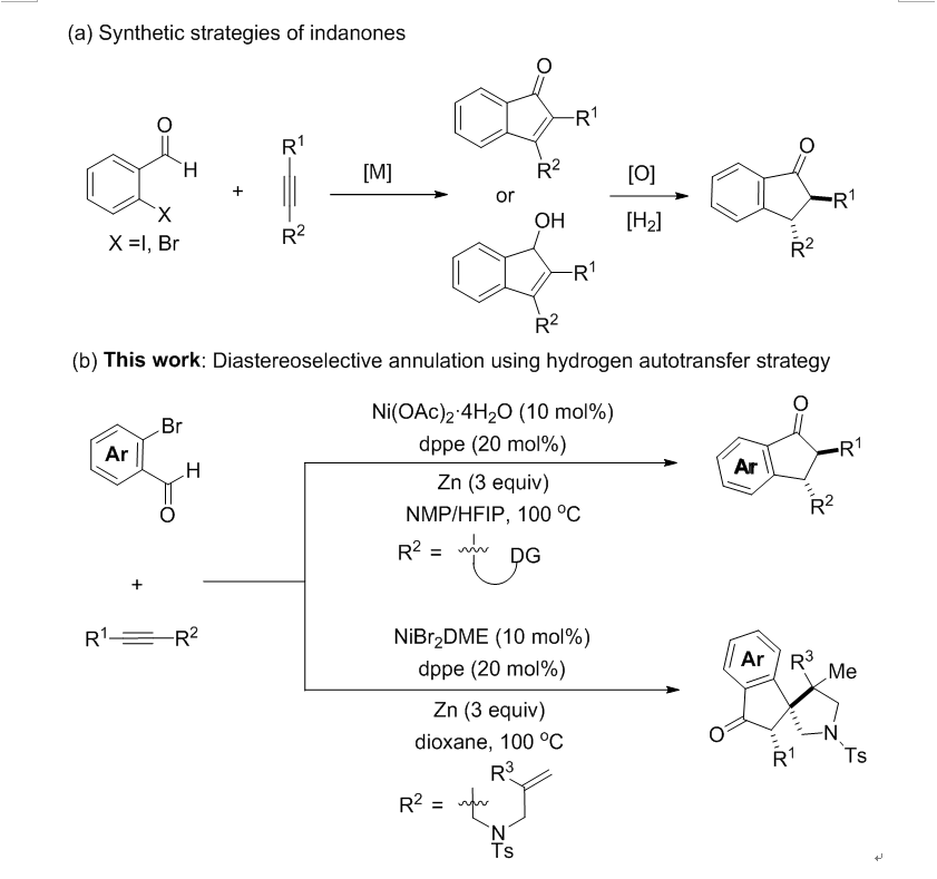 近日,Wiley-VCH旗下主打期刊Angewandte Chemie International Edition(《德国应用化学》)在线发表了至尊国际 孔望清课题组在镍催化氢转移反应领域取得的最新研究成果,论文题为“Synthesis of Indanones and Spiroindanones by Diastereoselective Annulation Based on a Hydrogen Autotransfer Strategy”(DOI: 10.1002/anie.202013792)。该工作利用镍催化不对称炔烃和邻溴芳香醛的借氢环化策略,实现了茚满酮和螺茚满酮吡咯烷衍生物的高区域选择性和高非对映选择性合成。
