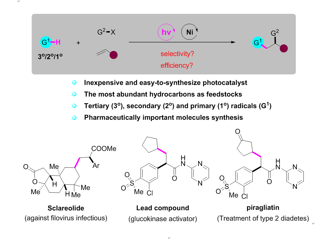 为了解决上述存在的问题,理想的策略是实现烷基C-H键直接参与的烯烃双官能团化反应。然而在无导向基团参与条件下实现高选择性的碳氢键官能团化,一直是有机化学领域非常具有挑战性的课题。近年来,廉价的光催化剂十钨酸四丁基铵(TBADT)通过氢原子转移(HAT)策略实现C(sp3)-H官能团化的反应被广泛研究,但是三组分的偶联反应还鲜有报道。至尊国际 孔望清课题组一直致力于烯烃的双官能团化反应的研究(J. Am. Chem. Soc., 2018, 140, 12364; ACS Catal. 2019, 9, 7335; ACS Catal., 2019, 9, 9127; Org. Lett., 2019, 21, 7498.),近日,该课题组通过HAT策略活化脂肪烃C(sp3)-H,实现了Ni催化的烯烃分子间烷基芳基化反应。该反应底物范围广,对三级、二级和一级烷基自由基均能很好地兼容,这是之前的方法所无法实现的。利用该反应,该课题组还实现了一系列复杂天然产物分子的后期功能化修饰;并通过三步反应实现了2型糖尿病药物分子Piragliatin的高效合成。