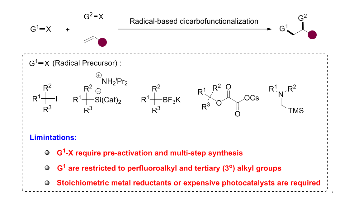 烯烃是简单易得的大宗化学品,烯烃的双官能团化反应可以快速构建复杂的分子,在有机合成中具有广泛的应用。传统过渡金属催化的烯烃双官能团化反应通常需要使用化学计量的有机金属试剂,因此限制了底物范围和反应的适用性。近年来,镍催化烯烃自由基类型的双官能团化反应取得了飞速的发展,可以使用如三级烷基卤、三级烷基硅、三级烷基硼酸盐等活化的自由基前体来代替有机金属试剂,因此具有十分广泛的官能团耐受性。尽管取得了一些成功,但是这类反应仍有较多缺陷:1. 这些自由基前体制备复杂,原子利用率低;2. 大部分反应只能兼容三级烷基自由基;3. 反应需要过量的金属还原剂或者昂贵的光催化剂。