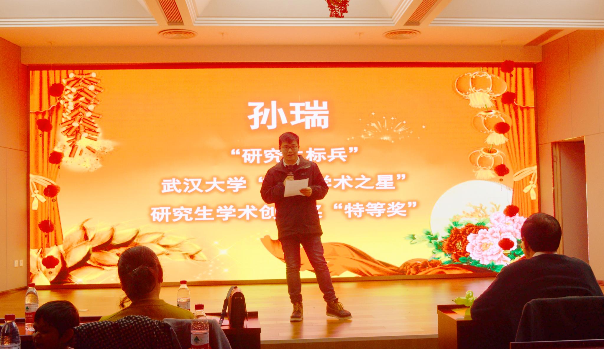 2019年至尊国际 “十大学术之星”(获奖者中唯一一名硕士)、“研究生标兵”、学术创新奖特等奖获得者、2017级硕士研究生孙瑞代表研究生发言。他首先表示由衷的感谢,坦言取得目前的成绩,得益于导师闵杰老师的学术指导和人格魅力影响、课题组同学的帮助以及高研院这一学术平台的支持。并分享了在硕士阶段科研的心得:不断的努力,不要轻易放弃。最后祝福老师们工作顺利!同学们新的一年科研顺利,成果多多!