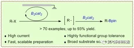 该团队基于硼化合物具有空p轨道的结构特性以及具有强亲电性的化学性质,发展了将硼试剂作为反应介质的电还原策略,实现了在较低还原电位下高效还原具有高还原电势而难以被还原的未活化烷基卤代物,同时利用硼试剂作为硼源实现了烷基硼化物的快速、高效构建。