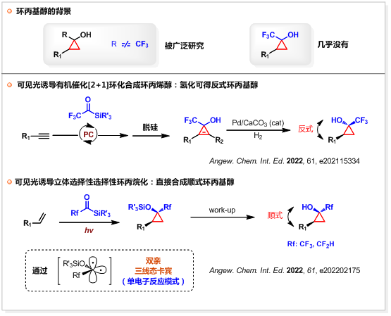 2022年,沈晓课题组将单自由基活化碳硅键拓展到双自由基活化碳硅键,首次实现了三氟甲基硅氧基卡宾的生成,并应用在环丙烯醇类化合物的合成中。环丙基醇和三氟甲基在生物活性分子和有机合成中都很重要,但是三氟甲基取代环丙基醇的选择性合成是一个巨大的挑战。因此作者将环化产物进行加氢反应,得到反式环丙醇类化合物(Angew. Chem. Int. Ed.2022,61,e202115334)。最近,沈晓课题组基于三(二)氟甲基比硅氧基体积大的假设,发展了三(二)氟甲基酰基硅衍生的卡宾与烯烃的非对映选择性环丙烷化反应,得到顺式选择性的产物,并提出了三线态卡宾(双自由基性质)的反应机理(Angew. Chem. Int. Ed.2022,61, e202202175)。戚孝天教授提供了理论计算方面的帮助。