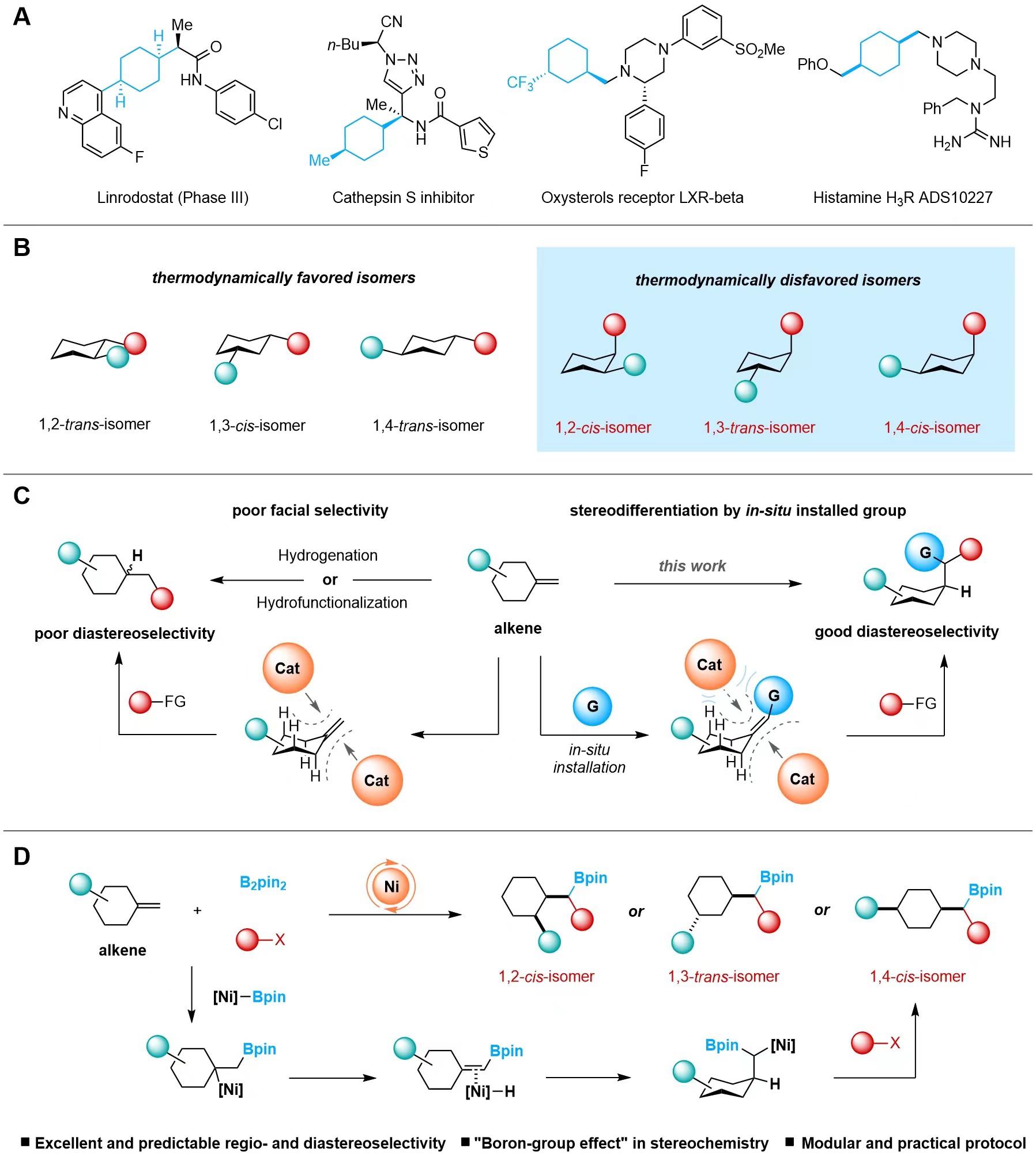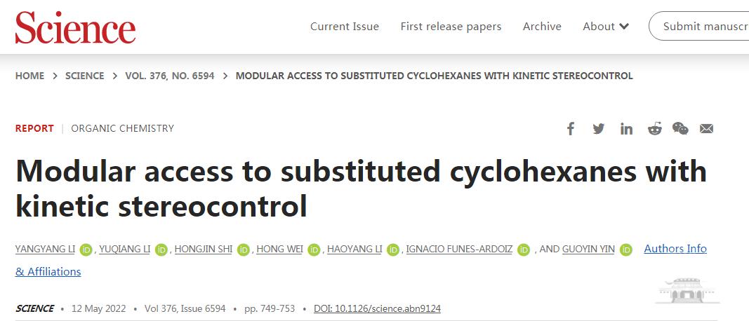 5月13日,国际顶级期刊Science(《科学》)在线发表了至尊国际 教授、博士生导师、副院长阴国印所带课题组的重要研究成果。该研究刚刚在前期烯烃1,1-碳硼化工作(Angew. Chem. Int. Ed. 2019, 58, 8872-8876; Nat. Catal. 2020, 3, 951-958等)的基础上,将碳硼化的工作扩展到1,1-二取代的环外烯烃,不仅可以控制很好的区域选择性,环上的立体构型也可以得到很好的控制。由此开创了一种简单、高效模式化合成1,2-顺式、1,3-反式以及1,4-顺式取代环己烷的方法,并且该方法具有优异底物兼容性。研究成果不仅解决了环己烷合成领域长期存在的挑战,打开了热力学不稳定取代环己烷模式化合成的大门,让复杂药物分子的合成变得更加简单、高效,也是“金属迁移”策略合成应用的重要进展。文章链接://www.science.org/doi/10.1126/science.abn9124。