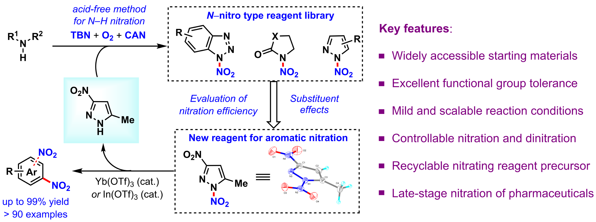 硝基芳烃作为一类重要的基础化学品,广泛应用于医药、农药、染料、香料和高能物质(炸药)等领域。现有的硝基芳烃制备方法主要依靠“混酸法”,存在污染重、腐蚀性强等缺点。因此,发展新型高效的“绿色”硝化试剂制备硝基芳烃具有非常重要的研究意义。