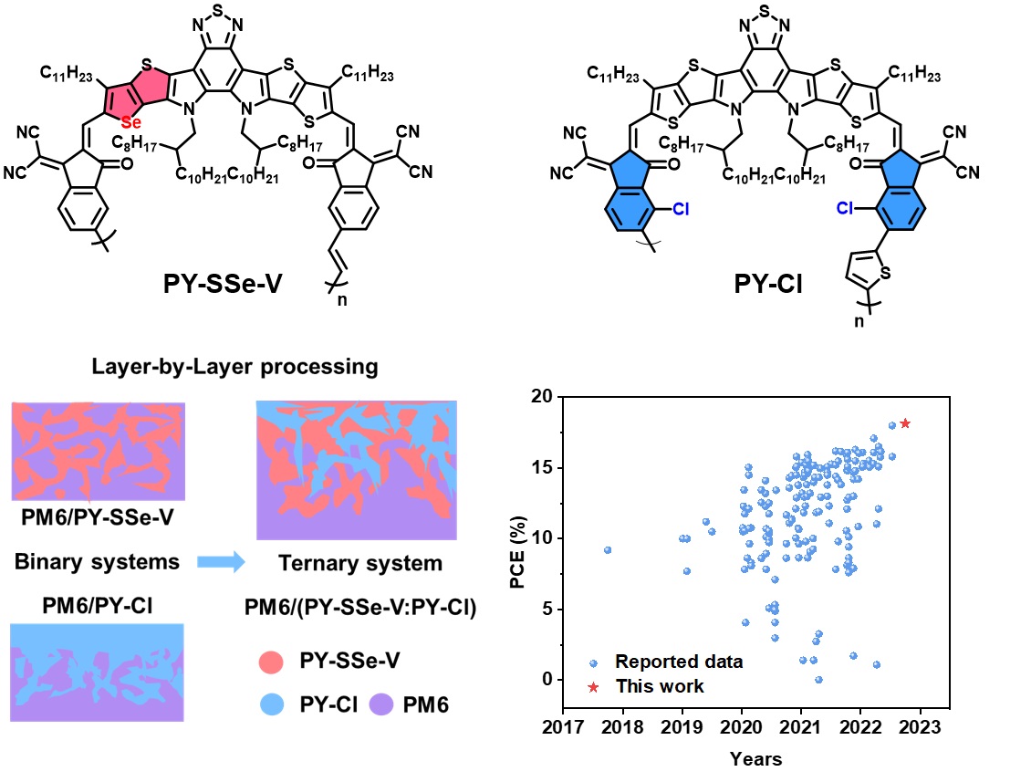 基于课题组前期在聚合物受体材料设计的研究(Joule 2020, 4, 1070–1086;Joule 2021, 5,1548-1565),作者在本工作中对受体中心核进行硒原子取代,合成了PY-SSe-V;通过端基氯化策略,合成了PY-Cl。进一步,作者采用逐层沉积(LbL)技术,将新开发的聚合物受体与聚合物给体PM6搭配,构筑了高效的二元all-PSCs,基于PM6/PY-SSe-V和PM6/PY-Cl的PCEs分别为17.03%和16.37%。然而,基于LbL工艺制备的PM6/PY-SSe-V活性层展现出类异质结形貌,而PM6/PY-Cl活性层表现为明显的伪双层形貌。为了进一步优化PM6/PY-SSe-V活性层形貌,作者将结晶性更强的PY-Cl引入到PM6/PY-SSe-V体系中。与PM6/PY-SSe-V二元体系相比,PM6/(PY-SSe-V:PY-Cl)三元体系的垂直相分布和分子堆积得到了明显改善,从而获得了18.14%的PCE,这是迄今为止报告的all-PSCs的最高值。总之,本工作通过在LbL处理的高效全聚合物体系中引入强结晶性的聚合物受体材料,优化了活性层垂直相分离形貌,为获得高效all-PSCs提供了一种简单有效的LbL型三元策略。