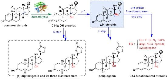 基于该化学酶法合成策略,他们仅需6‒7步就完成了强心苷类天然产物periplogenin、(+)-digitoxigenin及其三种非对映异构体的高效合成,充分展示了该策略在复杂甾体合成中的强大应用潜力。因此,该化学酶法策略不但为新型C14官能团化甾体的合成提供了新思路,也为相关甾体新药的开发铺平了道路。