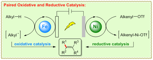 陆庆全课题组提出和发展了“配对氧化还原”策略,基于地球丰产金属铁和镍,并结合光电催化,在一体反应池中同时实现了铁的氧化催化循环以及镍的还原催化循环,避免了当量氧化剂和还原剂的使用,在极为温和的氧化电势条件下实现了烷烃的活化转化,进而通过镍催化的偶联反应将烷烃转化为了具有更高附加值的烯烃化合物。