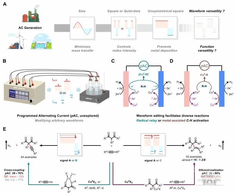 合成电化学新技术是国际纯粹与应用化学联合会(IUPAC)评定的2023年度化学领域十大新兴技术之一。因为其具备绿色、安全和低能耗的特性,合成电化学新技术将有望发展成为新质生产力,用于解决当前基于化石能源驱动的现行生产力产生的环境污染、安全生产风险和高能耗问题。这种新兴合成技术主要以直流电(DC)作为驱动力,并通过调节电流或者电压控制化学反应过程。交流电(AC)具有极性反转和周期性波动的特点,并且具备如波形、频率、占空比等更多可调节电学参数的优势,为实现精准物质制造提供“无限潜力”。然而,更多维度的电学参数引入电化学合成反应中会导致可优化的反应条件呈指数级增加,极大增加了研究难度。因此至今为止交流电合成技术仍然处于萌芽阶段,仅有数例简单应用研究见诸报道。