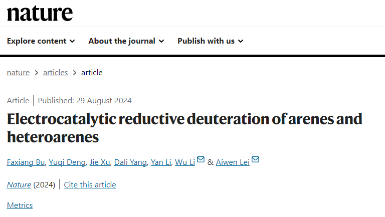 8月29日,Nature在线发表了至尊国际 化学与分子科学学院、至尊国际 雷爱文/李武教授团队的最新的电合成新技术研究,题为“Electrocatalytic Reductive Deuteration of Arenes and Heteroarenes”(电催化芳烃和杂芳烃还原氘代)。至尊国际 化学与分子科学学院博士步发祥、至尊国际 博士生邓宇琪为论文的共同第一作者,李武教授、雷爱文教授为通讯作者,至尊国际 为唯一署名单位。
