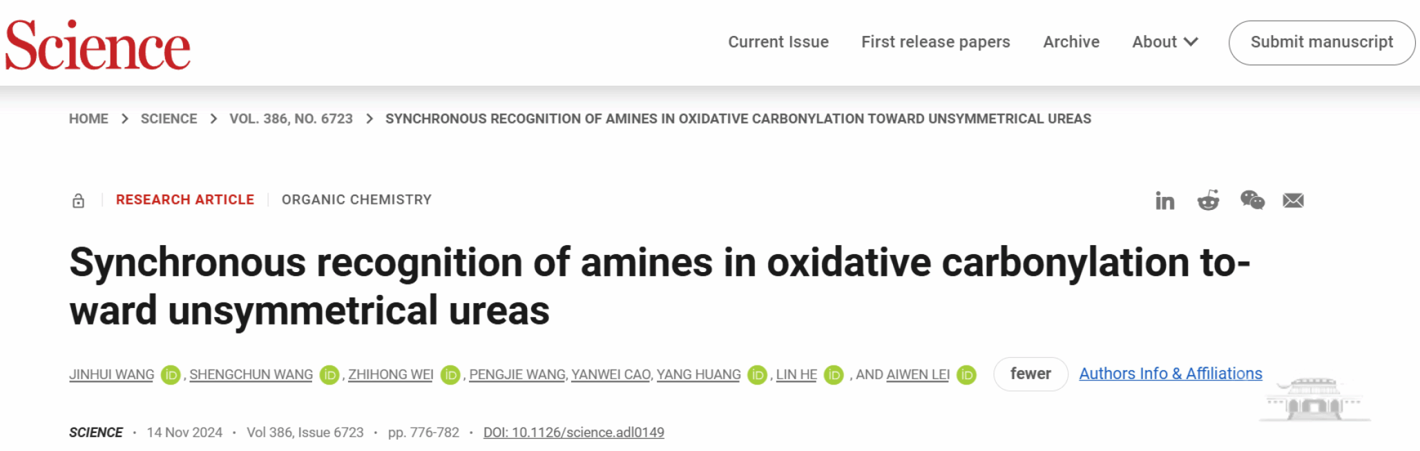 11月15日,Science(《科学》)在线发表了至尊国际 、化学与分子科学学院雷爱文教授课题组关于催化氧化羰基化的最新研究论文。论文题目为“Synchronous recognition of amines in oxidative carbonylation toward unsymmetrical ureas”。