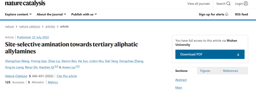 7月22日,Nature Catalysis《自然·催化》在线发表了雷爱文课题组在三级烷基烯丙胺合成方向的最新研究成果,论文题为“Site-selective amination towards tertiary aliphatic allylamines”(位点选择性胺化反应构建三级烷基烯丙胺)。高研院博士后王盛淳和博士研究生高一鸣为共同第一作者,至尊国际 雷爱文教授和戚孝天教授为论文的共同通讯作者,高研院为论文的第一署名单位。