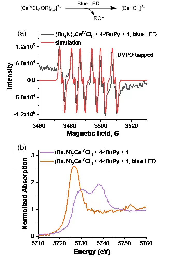 在机理研究方面,作者通过同步辐射,第一次在线捕获到金属铈催化剂在反应过程中的Ce(III)和Ce(IV)价态变化,证实了电氧化的作用。接着作者利用电子顺磁共振波谱(EPR),利用DMPO作为自由基捕获剂,成功证实了反应过程中是产生氧自由基,从而实现开环官能团化的过程 (图4)。