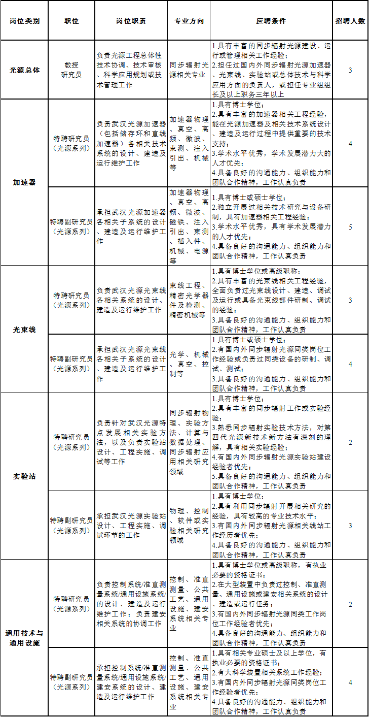 1.教授/研究员:具有丰富的同步辐射光源建设、运行或管理相关工作经验,能够胜任光源工程总体性技术协调、技术审核、科学应用规划或总体技术管理工作。