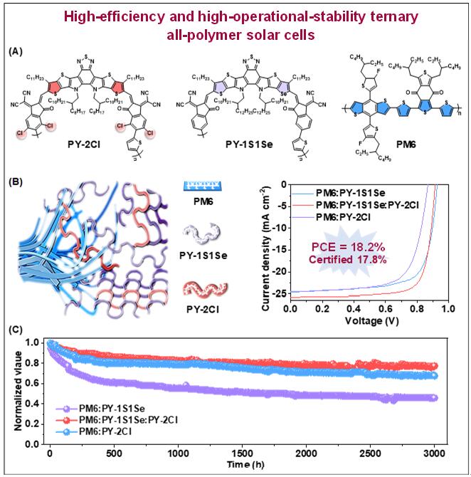 全聚合物太阳电池(all-PSCs)是由p-型聚合物给体和n-型聚合物受体材料制备的一类有机太阳电池,不仅具有可调的光学、电化学和电子结构特性,还表现出良好的光、热和机械稳定性,在可穿戴设备、柔性可拉伸器件和光伏建筑一体化中具有良好的应用前景。因此,发展高效且稳定的all-PSCs具有重要的科学意义和商业价值。然而,由于窄带隙、强吸收的聚合物受体材料种类相对匮乏,all-PSCs的光电转换效率(PCE)滞后于聚合物:小分子的光伏体系。开发聚合物受体新材料和探索活性层形貌调控新方法是进一步提升all-PSCs性能最为重要的策略。许多研究表明三元共混策略有助于拓宽光谱的捕获和实现理想的纳米共混形态,从而优化光电转换过程。