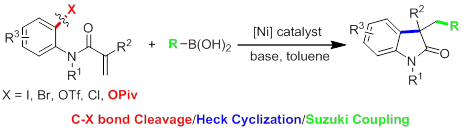 20. Yuxiu Li, Kuai Wang, Yuanyuan Ping, Yifan Wang, and Wangqing Kong*. Nickel-Catalyzed Domino Heck Cyclization/Suzuki Coupling for the Synthesis of 3,3-Disubstituted Oxindoles. Org. Lett. 2018, 20, 921−924 (Highlighted by Synfacts, 2018, 14(4), 410)